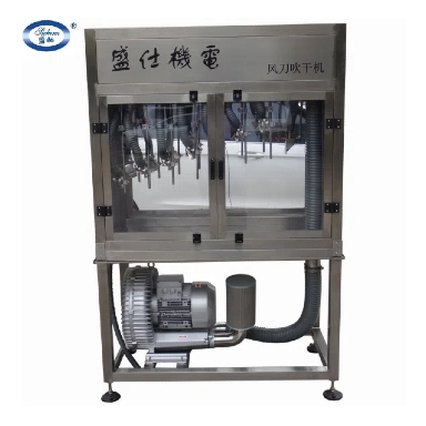 答:1、針對(duì)貼標(biāo)前的干燥要求進(jìn)行設(shè)計(jì),采用專利設(shè)計(jì)風(fēng)刀,把高速風(fēng)引致玻璃瓶表面,快速切除水份,以更低功率(高壓鼓風(fēng)機(jī)配合風(fēng)刀—···